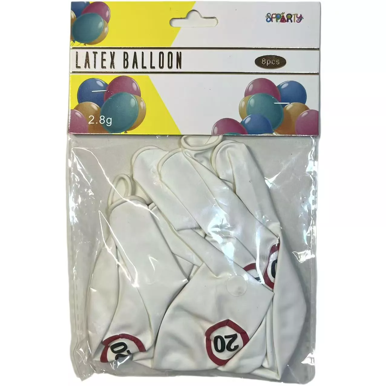 2.8g White Number 20 Printed Latex Balloon 8pcs Per Pack